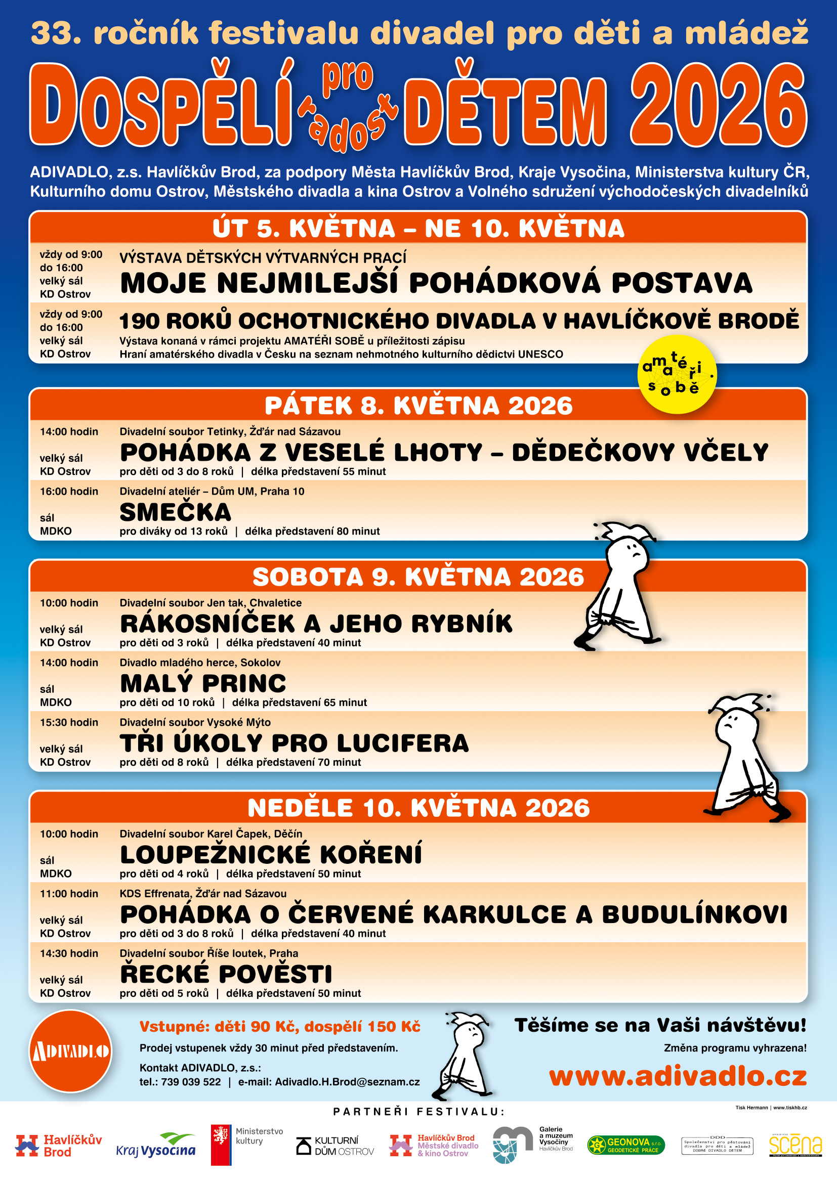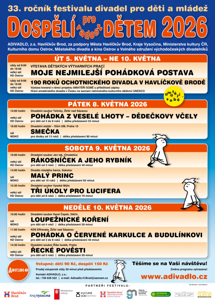 Regionální přehlídka Dospělí (pro radost) dětem 2026 je přehlídkou amatérských divadelních souborů dospělých s inscenacemi pro děti a mládež s možností postupu inscenace na celostátní přehlídku amatérského divadla pro děti a mládež Divadelní Fimfárum v Českém Krumlově. Více o organizaci celostátní přehlídky najdete na stránkách https://www.nipos.cz/artama-do-cdpdm/